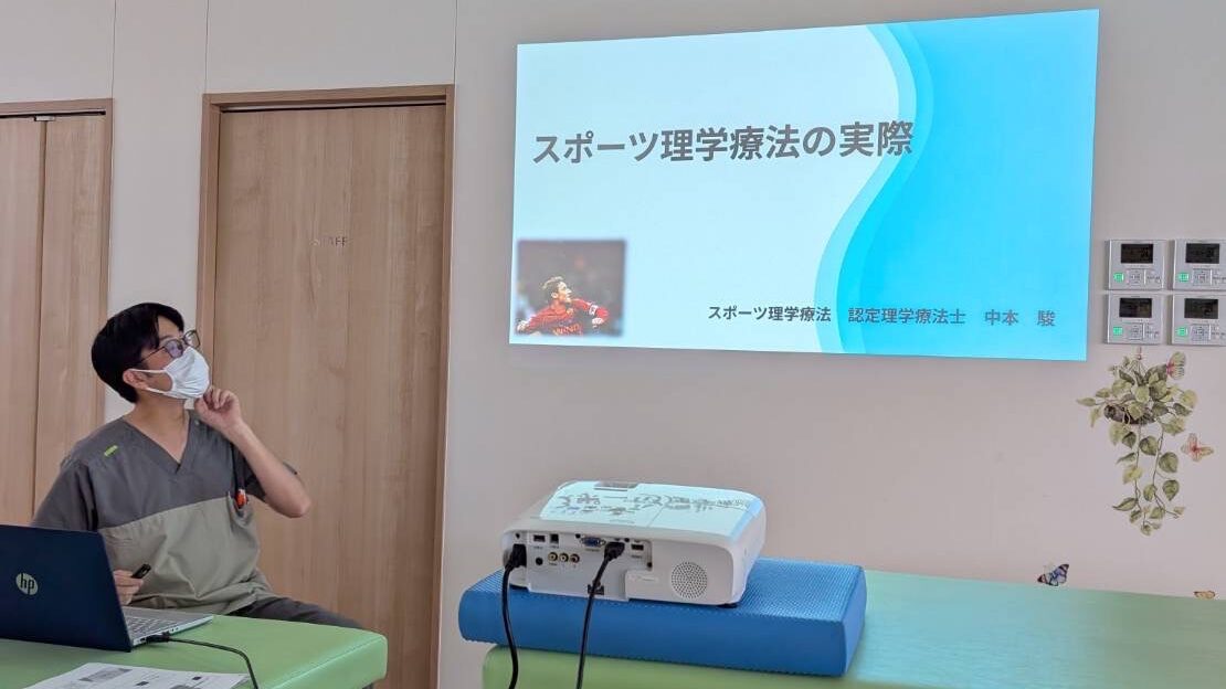 今回は「スポーツ理学療法」をテーマに、当院リハビリスタッフの中でも長年スポーツリハビリ分野に携わり、スポーツ理学療法の認定理学療法士の資格を有する私(中本)が講師を務め、院内スタッフへ向けて勉強会を実施しました。