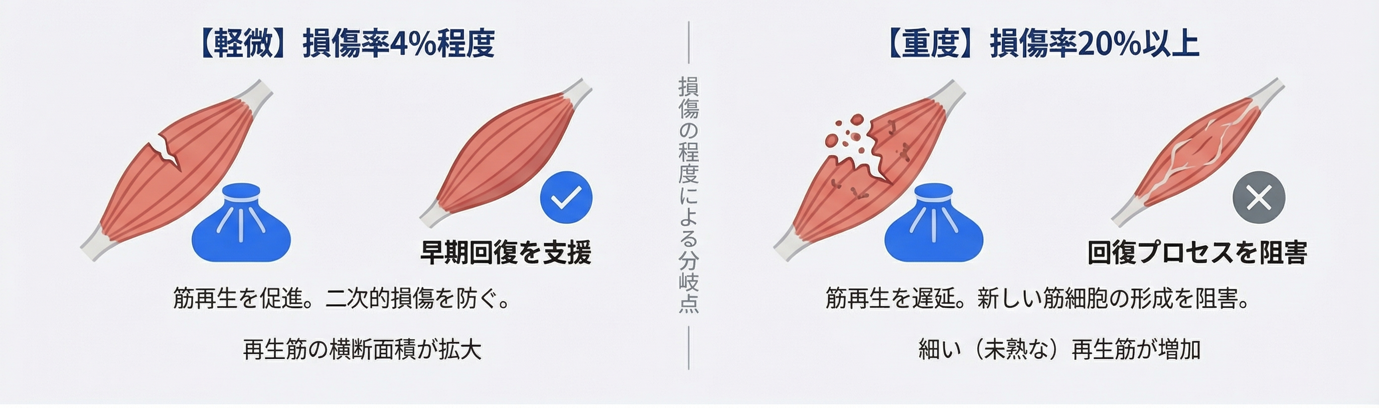 一方で、全てのアイシングがダメなわけではありません。最新の研究(2023年発表)では、「軽微な筋損傷(損傷した線維が全体の4%程度)」では、筋肉の再生を促すことが世界で初めて示されました。