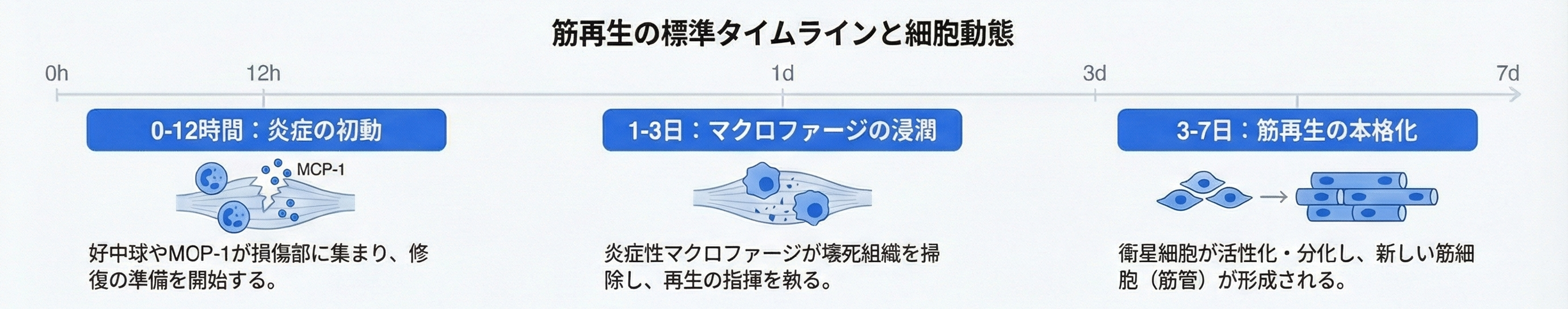 筋肉が損傷すると、体内ではマクロファージと呼ばれる免疫細胞が「司令塔」として重要な役割を果たします。