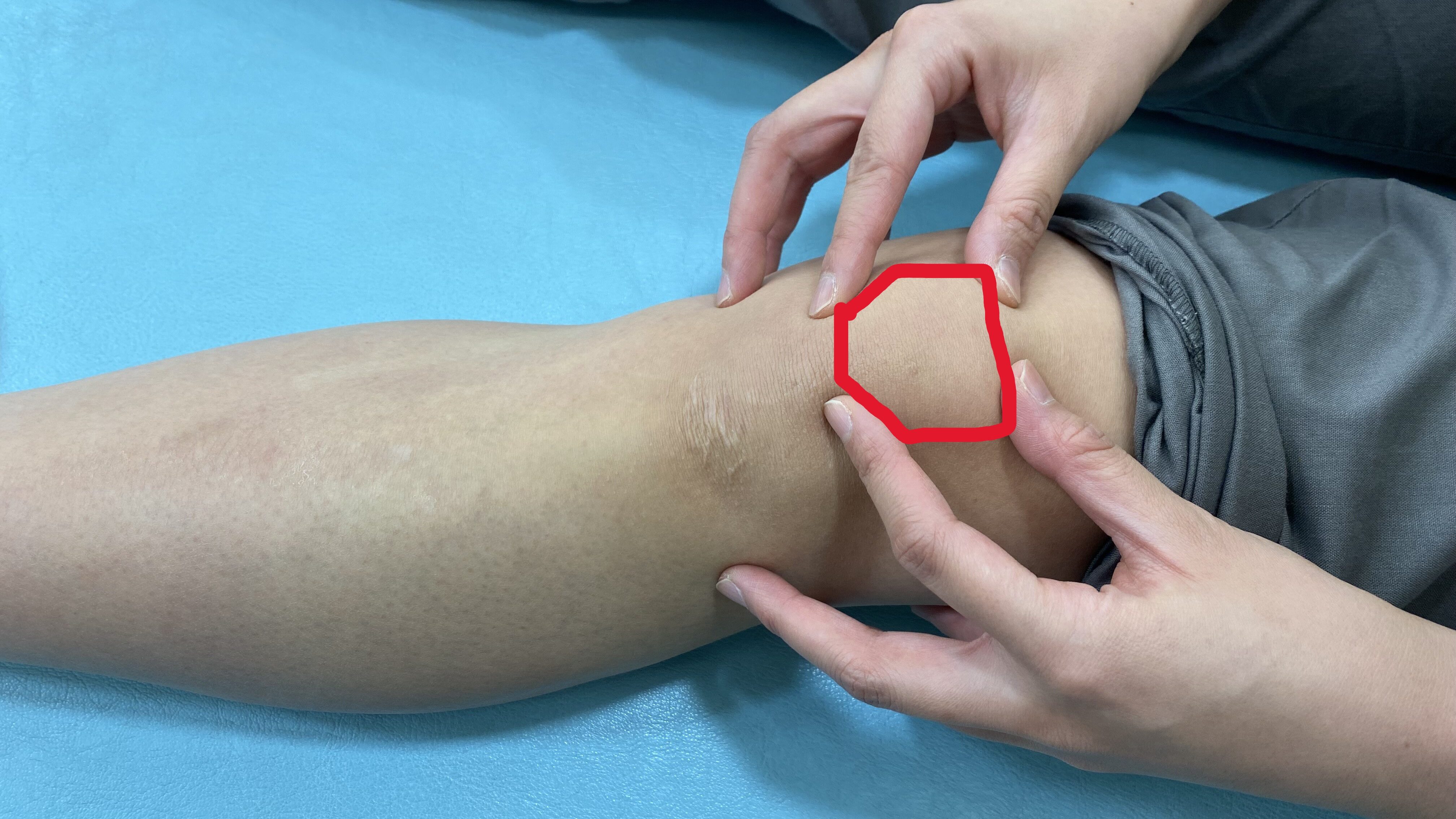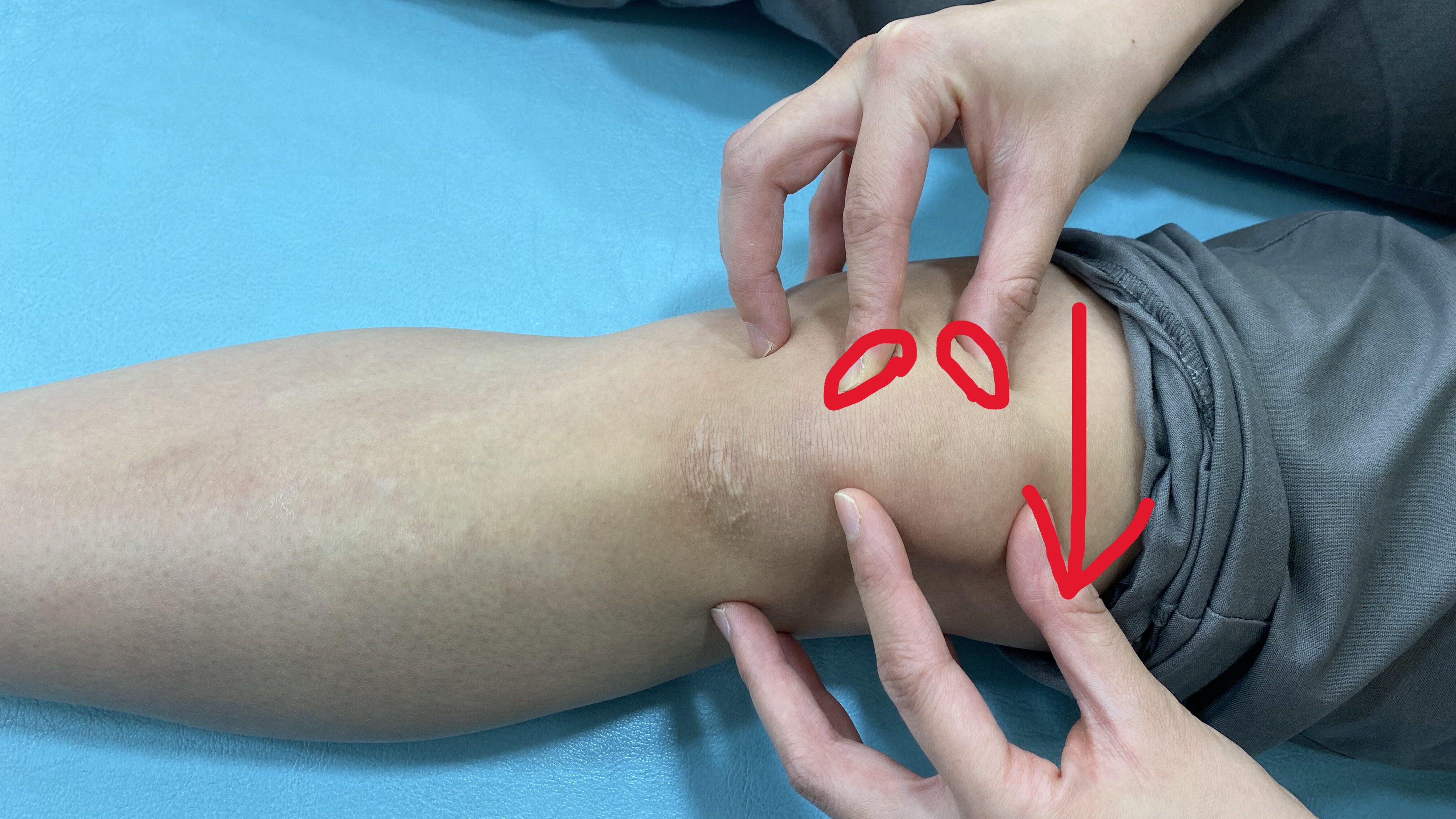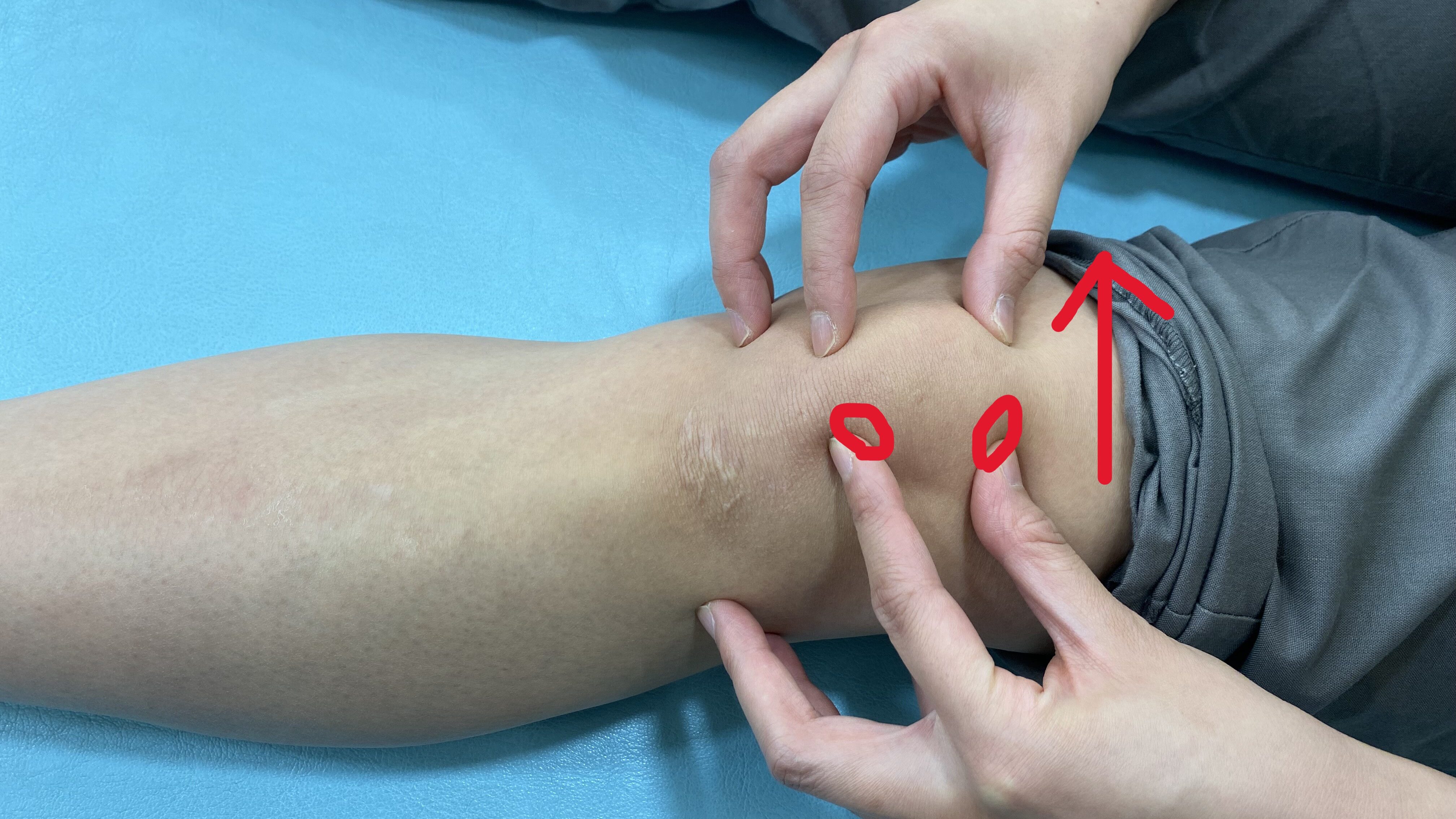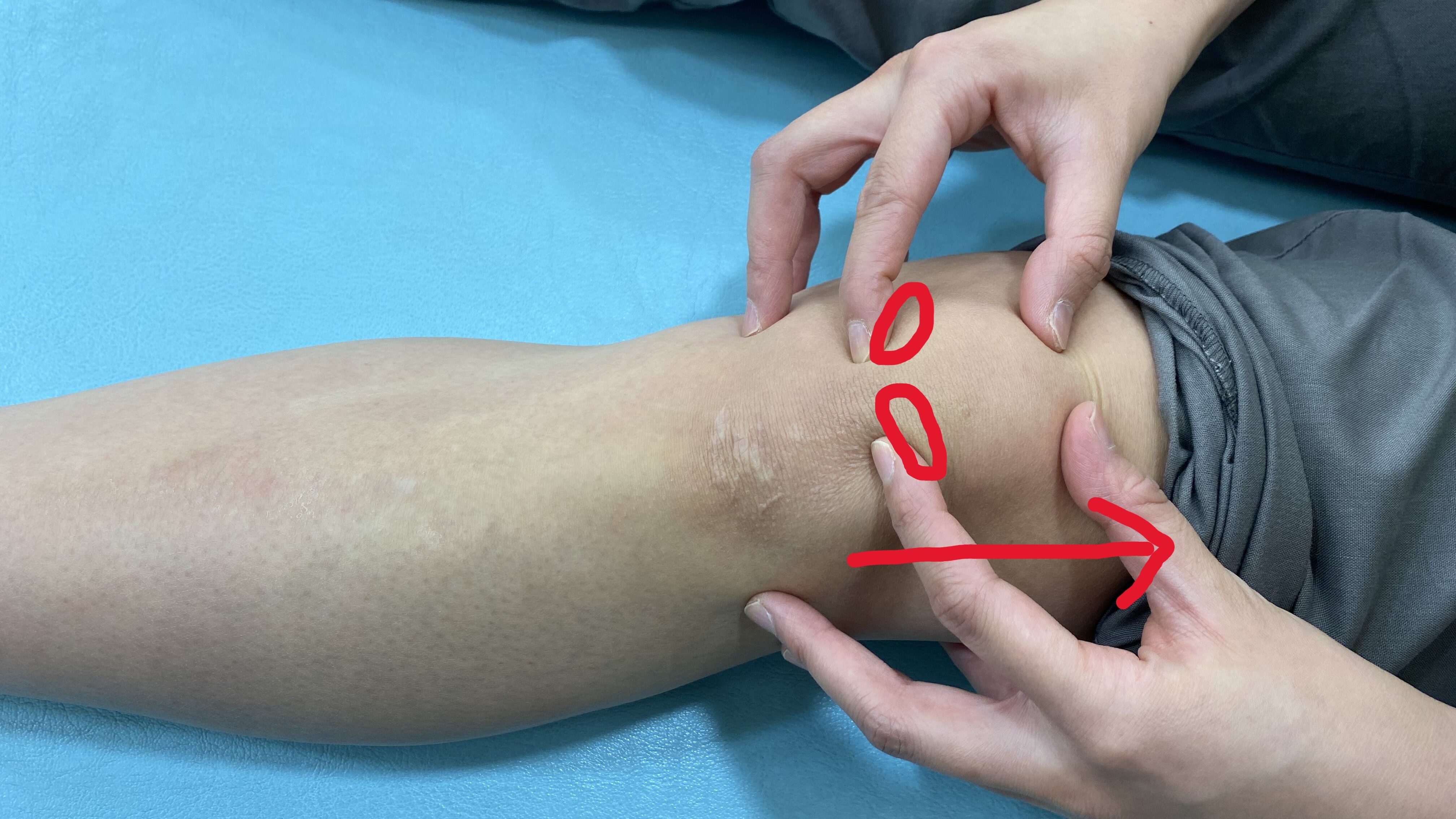 ・上から膝蓋骨をつかみ、上下左右に動かします。