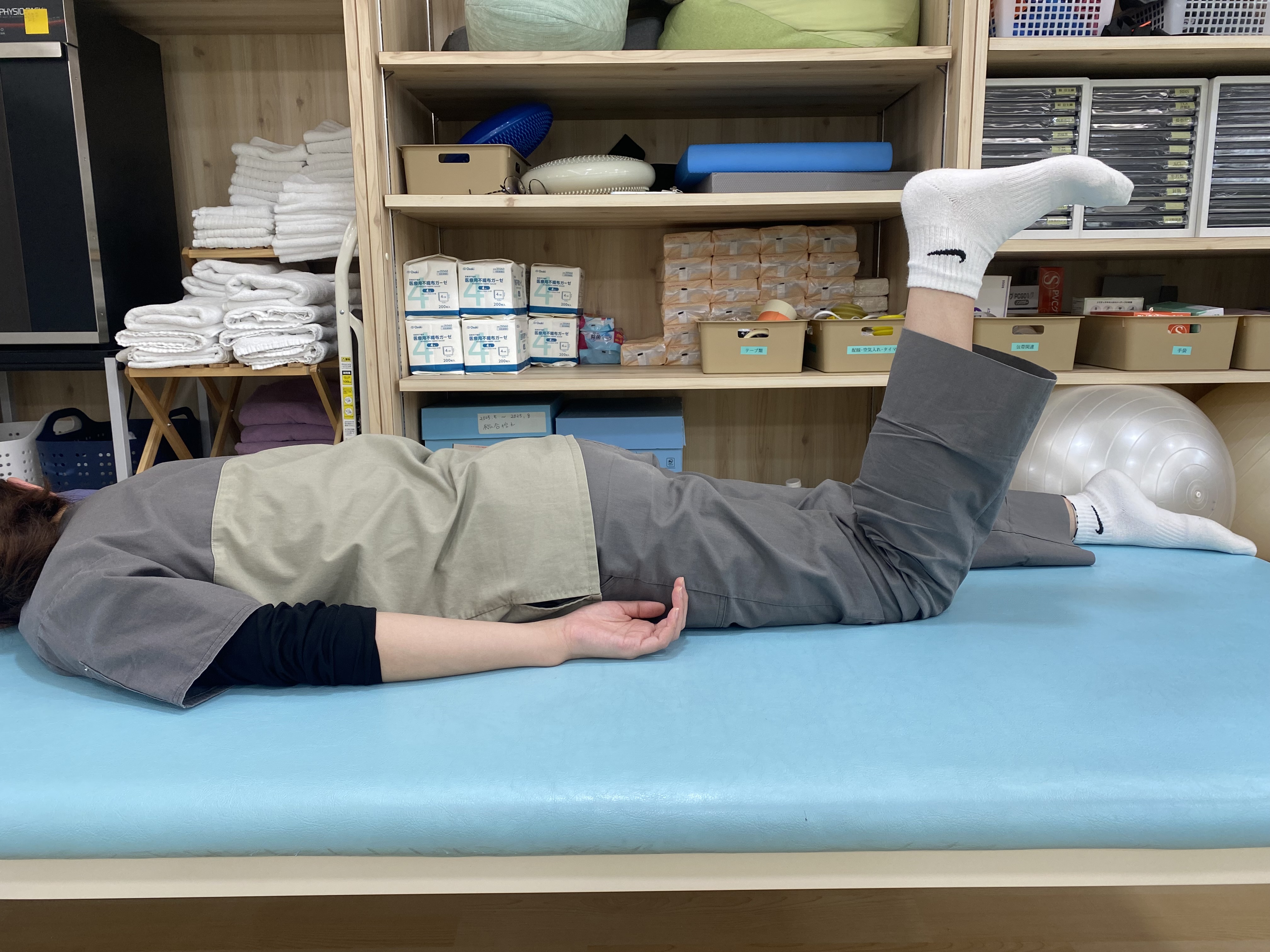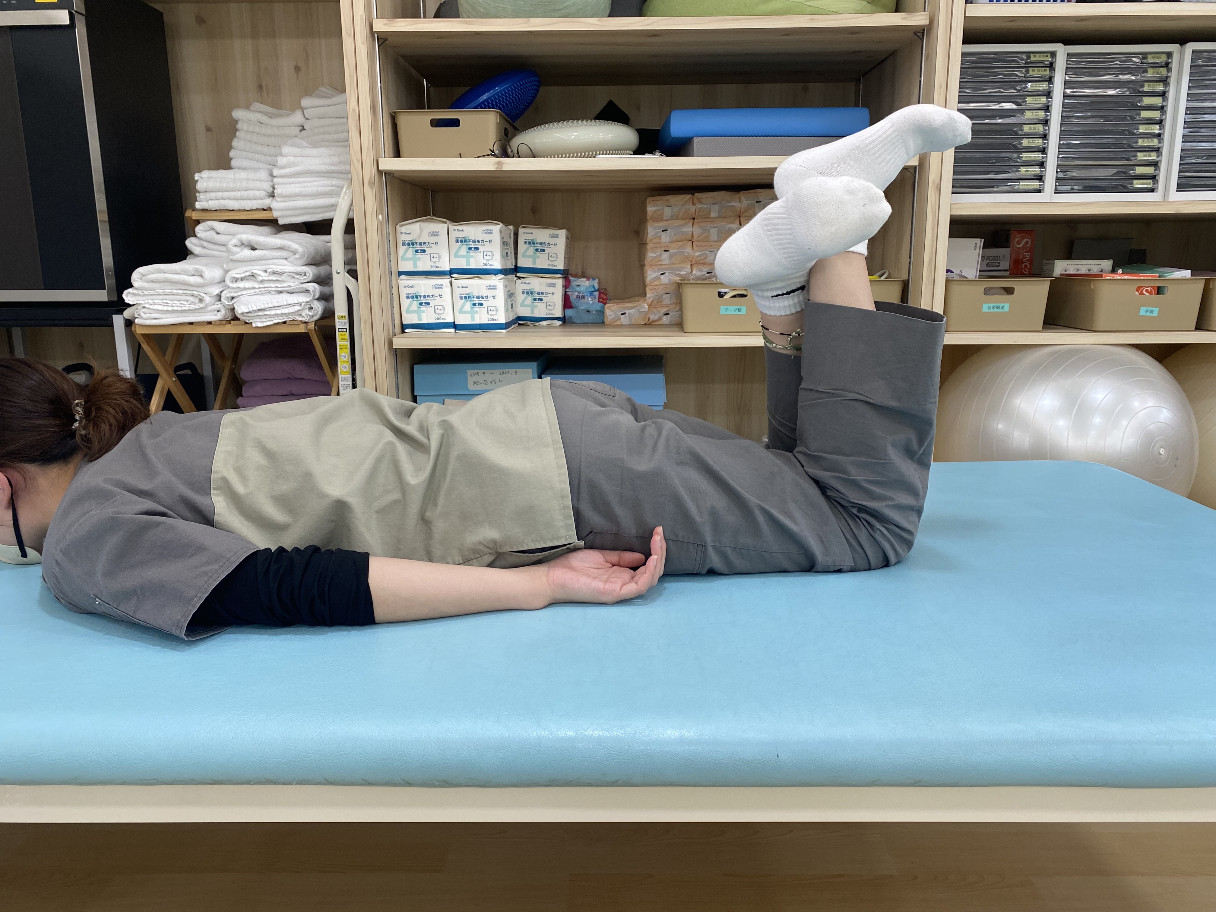 ・痛い方の足は膝を曲げるように力を入れ、痛くない方の足をそれを邪魔するように抵抗を加えます。