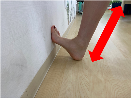 1.壁に向かって立ち、つま先を壁に立てかけます。このときできるだけ高い位置までつま先を上げましょう。