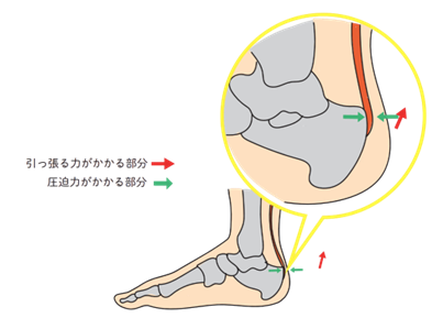 アキレス腱と、かかとの骨が付着している部位(付着部)に、引っぱる力が加わります。またその少し上では腱と骨が接しているため、互いに圧迫力を受けています。これらの力が繰り返し加わることで、付着部に変性が生じ、痛みを起こします。