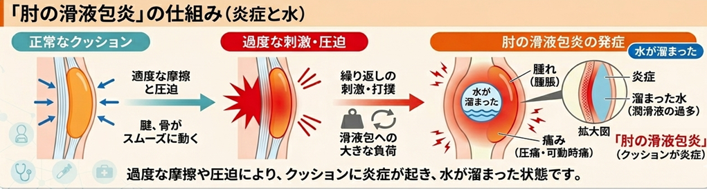 このクッションに過度な摩擦や圧迫が加わり、炎症を起こして水が溜まってしまった状態が「滑液包炎」です。