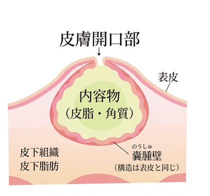 粉瘤は、皮膚の下にできた「袋(嚢腫)」の中に、本来は剥がれ落ちるはずの「角質(垢)」や「皮脂」が溜まってしまった状態です。