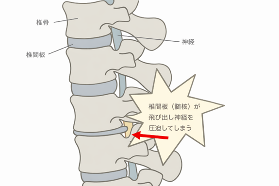 頚椎ヘルニアとは、首の骨と骨の間にある椎間板が、年齢による変化や首への負担によって飛び出し、神経を圧迫することで起こる病気です。タイヤのパンクのように、ある日突然に発生します。